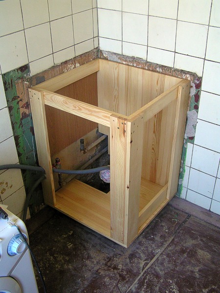 Дорисовано левое крыло кухни, придумано место для вытяжки, выдвижной ящик над стиральной машинкой. Вписана газовая плита.